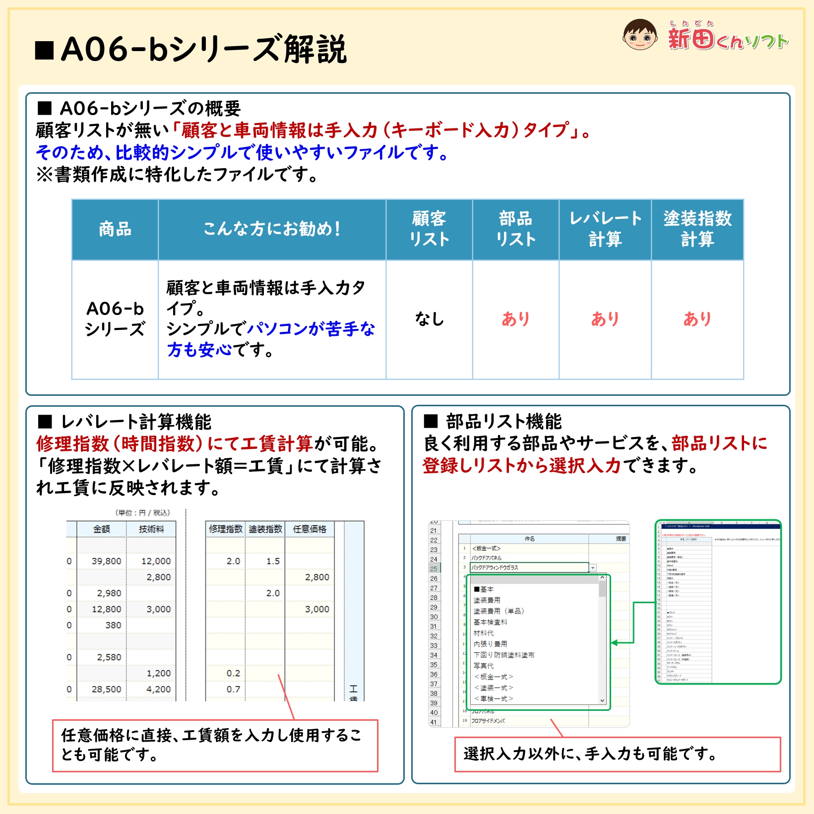 【商品紹介】A06-bシリーズの商品説明(塗装指数請求書) 2025.10.12 ▶当シリーズの特徴 A06シリーズは、A07シリーズに塗装指数計算機能を組み込んだタイプです。板金塗装業務で塗装費用の計算を行いたい方にお勧めです。 その中の当商品(bシリーズ)は、顧客情報や車両情報は自由に手入力できるタイプです。もちろんレバレート計算と部品リスト機能はあります。また、レバレート計算を利用しない使い方も可能です。 ▶お勧めな人 ・塗装指数計算機能が欲しい方。 ・顧客情報と車両情報を手入力で利用したい方 ・パソコンが苦手な方。 ▶主な仕様 ・作成可能書類:請求書 / 見積書 / 納品書 / 領収書 ・連続作成枚数:3ページまで ・印刷用紙:通常のA4コピー用紙 ・作動ソフト:Microsoft Excel ※使用にはExcelが必要です。 ▶主な機能 ・顧客リスト:なし ≪必要な方は「A06-cシリーズ」を確認。 ・部品リスト:あり ・修理レバレート計算:あり ・塗装費計算:あり ▶塗装指数計算について ・塗装に関する基準値(塗装指数値)は組み込まれてません。 ・御社でお使いの「塗装指数値」を手入力でご使用ください。 ・指数値や加算値を入力すると、塗装費用が自動計算されます。 ・指数計算に入れたくない塗装費用は「任意価格」で入力可能。 ・説明画像で御社業務に適してることを確認し購入ください。 ▶ファイルの利用方法 ファイルは都度コピーし利用いただきます。その利用方法を解説しています。 ≫ファイルの利用方法について ≫詳細を見る ★下記画像は「クリックすると拡大」できます。 ■ 各ファイルのご紹介 ▶ファイルの種類 A06-bシリーズは下記2種類からお選び頂けます。 ・A06-b2:自動車業務系に良くある一般的な書面構成です。 ・A06-b4:明細左端に日付欄がある。 【迷った方は?】 どれが良いか迷った方は「A06-b2」をチェック下さい。また、月末請求など明細内に日付欄が必要な方は「A06-b4」をチェック下さい。 1)A06-b2ファイル 【当ファイルの特徴】 A06-b2ファイルは、一般的な自動車業務向けの書面構成です。人気のあるファイルです。 【お勧めな人】 ・一般的な請求書構成の物が欲しい方。 ・明細内に日付欄が必要ない方。 ・どれを選べばよいか迷われた方。 ▶販売ページはこちら ≫Yahooショッピング店(郵送版)商品ページへ ≫BASE店(ダウンロード版)商品ページへ ※現在準備中です。 ★下記画像は「クリックすると拡大」できます。 2)A06-b4ファイル 【当ファイルの特徴】 A06-b4ファイルは、明細内左端に「日付」表記ができるタイプです。明細内の作業を「いつ行ったか?」など、作業毎に日付表記が可能です。 【お勧めな人】 ・月末締めや長期修理などで、作業毎に日付を表記されたい方。 ▶販売ページはこちら ≫Yahooショッピング店(郵送版)商品ページへ ≫BASE店(ダウンロード版)商品ページへ ※現在準備中です。 ★下記画像は「クリックすると拡大」できます。 ■ A06シリーズ共通機能 ★下記画像は「クリックすると拡大」できます。 Tweet Share Hatena Pocket RSS feedly Pin it 経理書類(請求書等) A06-b, A06シリーズ, 商品説明, 塗装指数計算, 請求書 コメント: 0 【商品紹介】C10シリーズの商品説明(預り領収書) 【商品紹介】A06-cシリーズの商品説明(塗装指数請求書) 関連記事一覧 【インボイス制度】A01シリーズの対応状況は?(一般業... 2023.04.20 【商品紹介】A07-bシリーズの商品説明(請求書) 2025.08.07 【商品比較】旧A07ファイルとQA07-aファイルの違いは?... 2023.03.13 【商品比較】A02シリーズ商品の違いは?(請求書ファイ... 2024.08.20 【商品紹介】A06-cシリーズの商品説明(塗装指数請求書) 2025.10.12 【商品比較】A09シリーズ商品の違いは?(請求書ファイ... 2024.09.08 【商品紹介】C10シリーズの商品説明(預り領収書) 2025.10.11 【インボイス制度】A07-aシリーズの対応状況は?(自動... 2023.02.27 コメント ( 0 ) トラックバックは利用できません。 この記事へのコメントはありません。